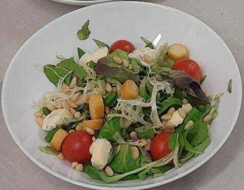 Composition : mâche, mesclun, pignon de pin, tomates cerises, bleu de Bresse, croutons