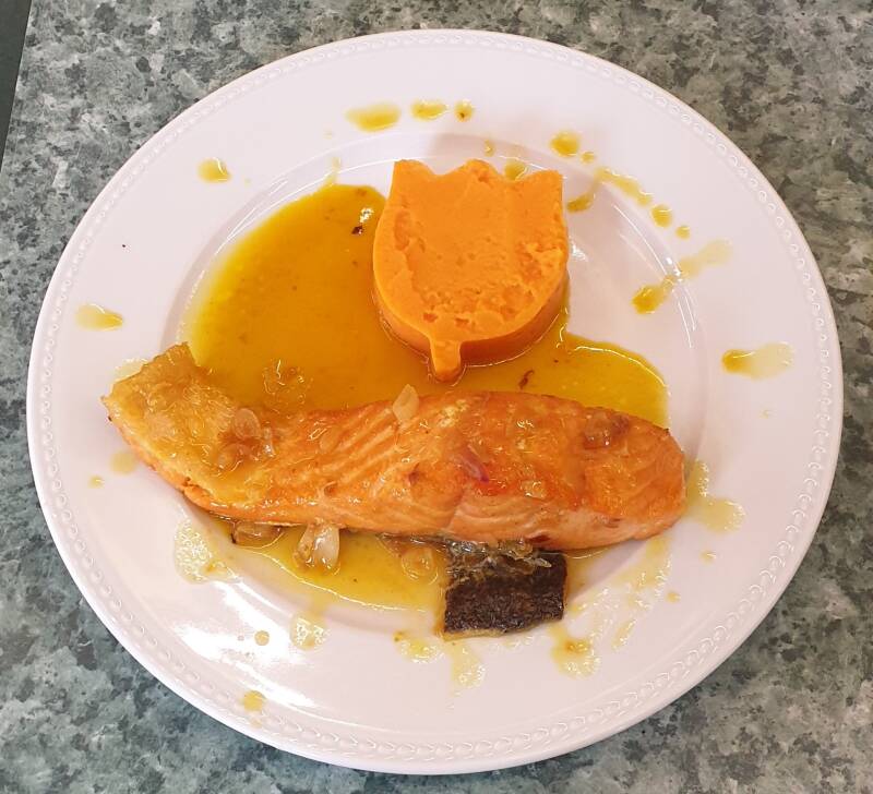 Saumon sauce curry thaï accompagné de purée de patate douce : 12€